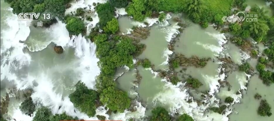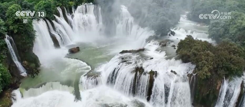 跟隨鏡頭,現(xiàn)在我們來到廣西崇左的德天跨國(guó)瀑布。它發(fā)源于廣西的歸春河,流向越南,又繞回廣西,最終在德天村遇斷崖形成瀑布。眼下,正值豐水期,德天跨國(guó)瀑布迎來最佳觀賞季。浩浩蕩蕩的河水從斷崖層層跌落,發(fā)出震撼的轟鳴聲,激起的水花騰空而上,讓人不禁感嘆大自然的神奇與美妙。