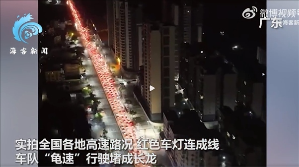 據??托侣劰俜轿⒉?,10月4日,中秋國慶假期進入第6天,多地陸續(xù)迎來返程高峰。實拍全國各地高速路況,紅色車燈連成線,車隊“龜速”行駛堵成長龍。有網友曬出高速路況畫面表示“特意提前三天回去,沒想到又堵路上了。”、“帶回的特產都要在路上吃完了”。