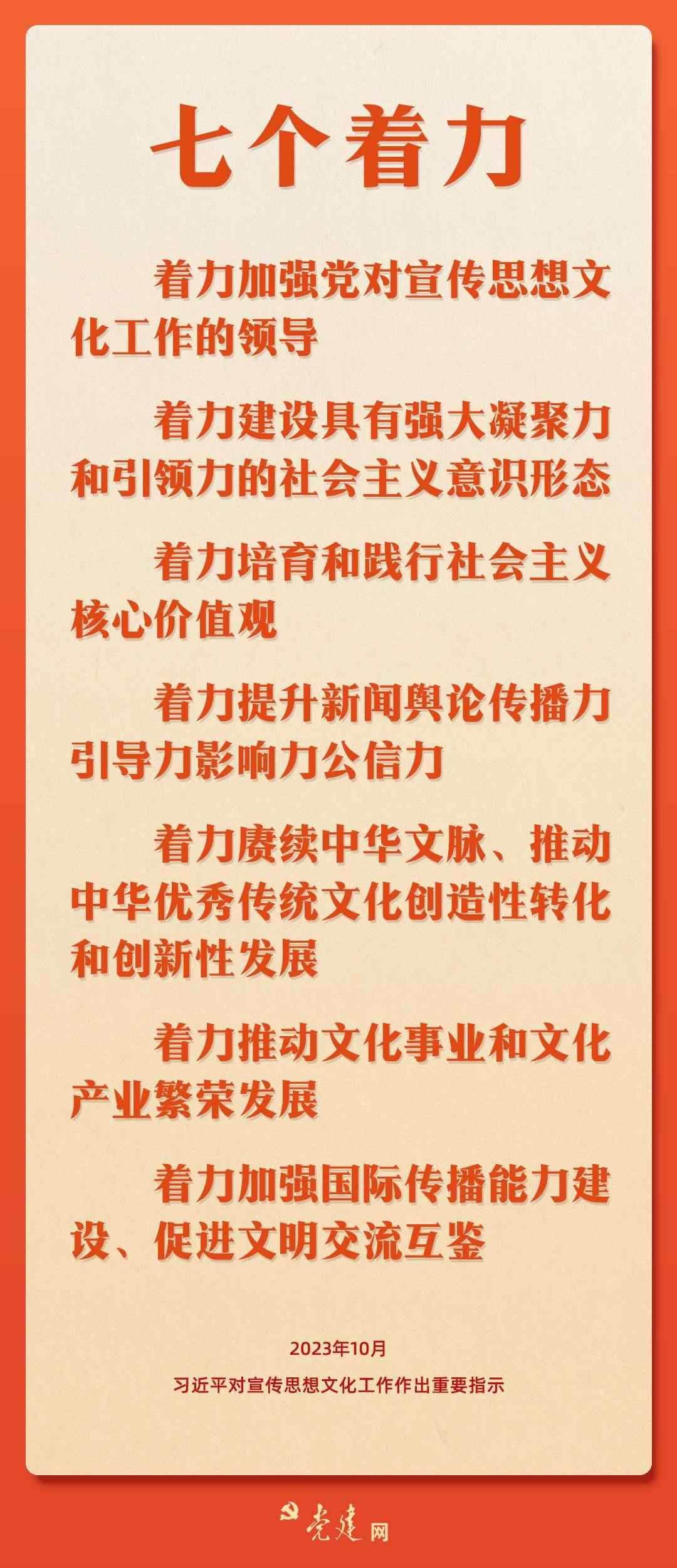 10月7日至8日,全國宣傳思想文化工作會議在京召開。會議傳達(dá)了習(xí)近平總書記對宣傳思想文化工作的重要指示,并首次提出習(xí)近平文化思想。快來一圖學(xué)習(xí)會議精神要點!