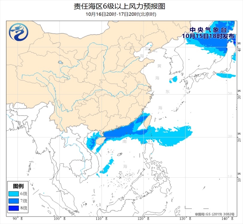 15日夜間至18日白天,臺灣海峽、臺灣以東洋面、巴士海峽、南海北部和中部海域、北部灣、瓊州海峽將有6~7級、陣風8~9級的偏北或東北風。