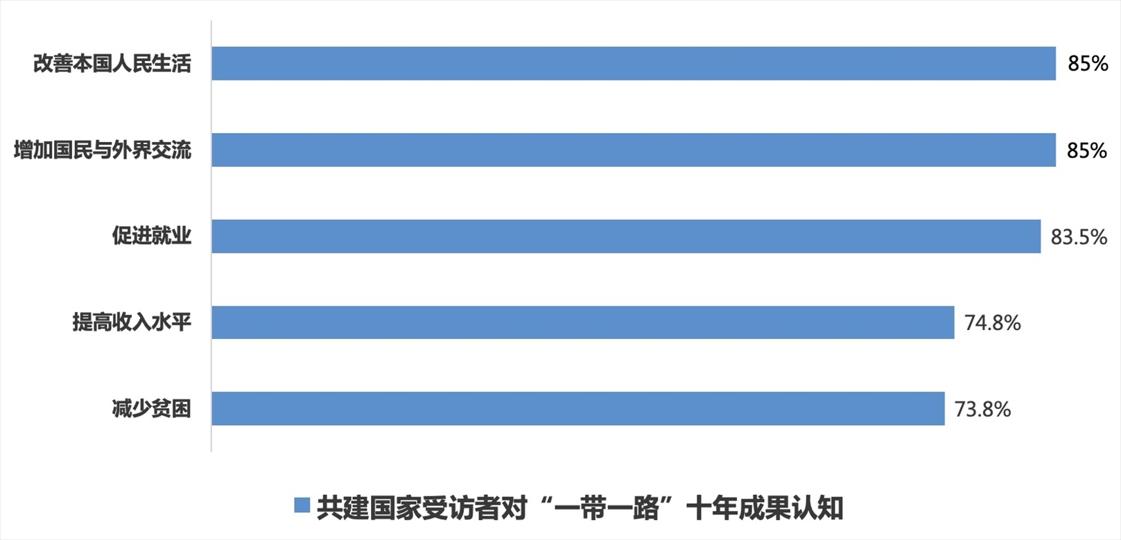 “一帶一路”倡議下一個(gè)個(gè)“惠而實(shí)”的民生工程、民心工程,為各國(guó)人民帶來(lái)實(shí)實(shí)在在的獲得感、幸福感和安全感,85%的共建國(guó)家受訪(fǎng)者認(rèn)為“一帶一路”切實(shí)改善了本國(guó)人民的生活;85%的共建國(guó)家受訪(fǎng)者認(rèn)為通過(guò)“一帶一路”民眾獲得了更多與外界交流互鑒的機(jī)會(huì);分別有83.5%、74.8%和73.8%的共建國(guó)家受訪(fǎng)者認(rèn)可共建“一帶一路”在促進(jìn)就業(yè)、提高居民收入水平和減少貧困方面的作用;86.5%的共建國(guó)家受訪(fǎng)者認(rèn)為“一帶一路”倡議和“以人民為中心”的理念高度契合,惠及全球民眾的愿景正在逐步變?yōu)楝F(xiàn)實(shí)。