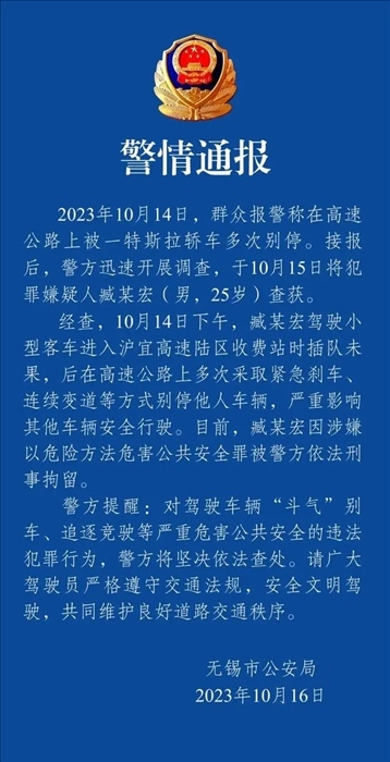 ·特斯拉插隊未果多次在高速上逼停同一車輛,無錫警方:司機涉嫌危害公共安全罪,刑拘!