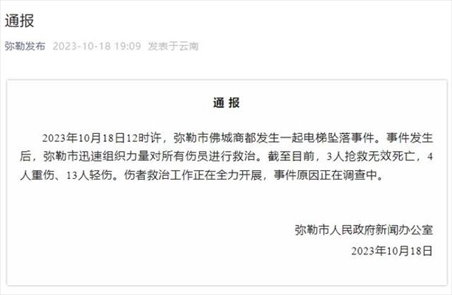 ·云南彌勒發(fā)生一起電梯墜落事件,致3人死亡17人受傷。