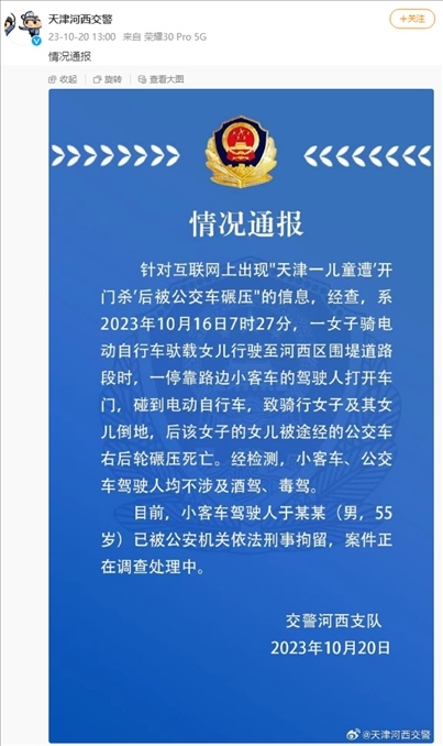 ·天津警方通報(bào)“兒童遭開(kāi)門(mén)殺后被公交碾壓死亡”:小客車(chē)駕駛?cè)艘驯恍淌戮辛簦讣谡{(diào)查處理中。