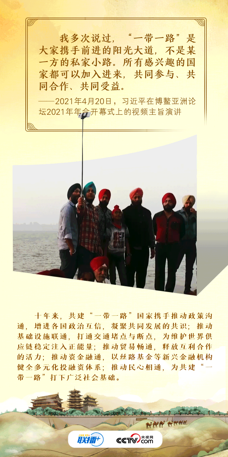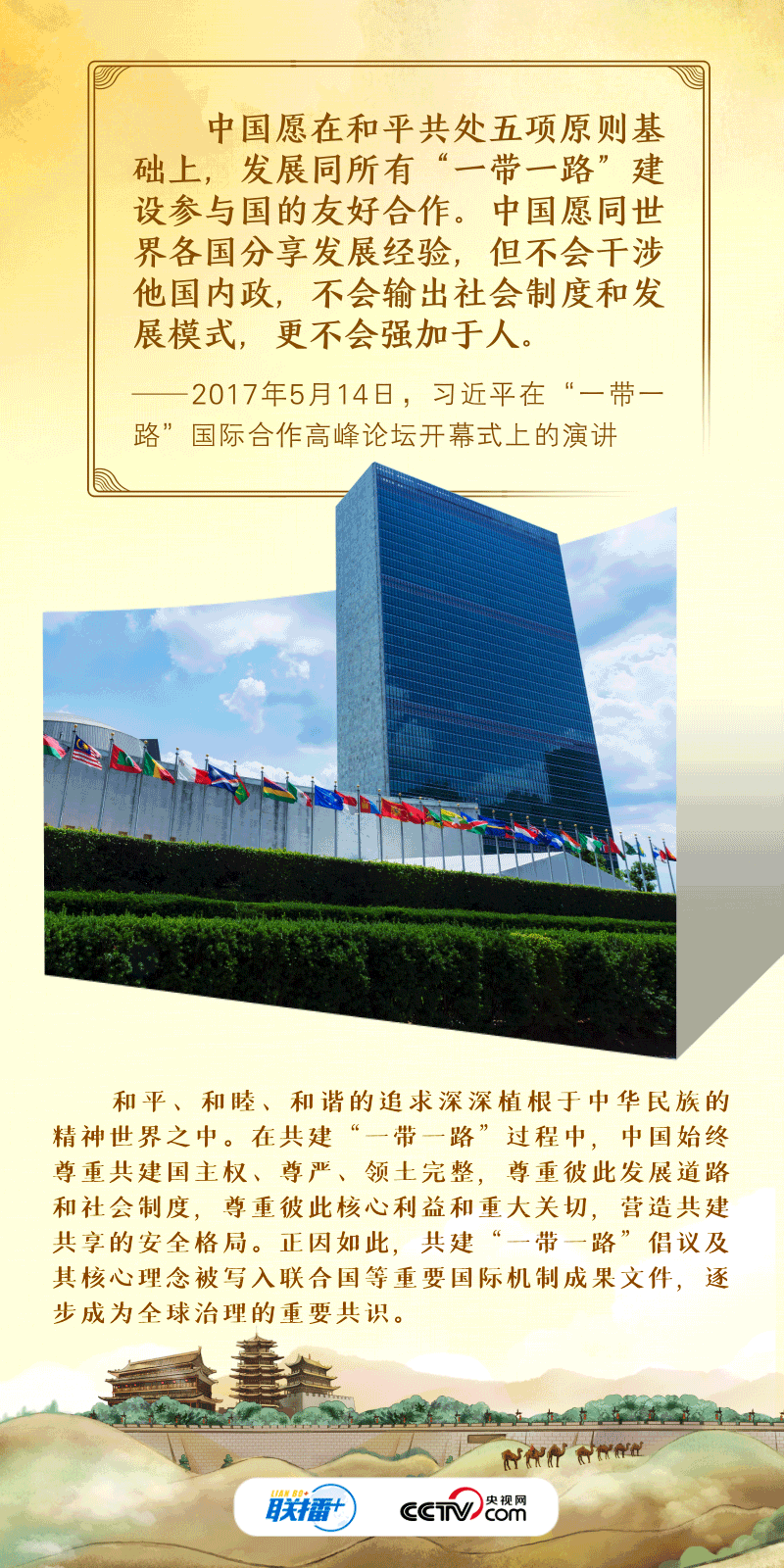 “古絲綢之路綿亙?nèi)f里、延續(xù)千年,積淀了以和平合作、開放包容、互學(xué)互鑒、互利共贏為核心的絲路精神?!?017年,習(xí)近平主席在首屆“一帶一路”國際合作高峰論壇開幕式上系統(tǒng)闡述了絲路精神的內(nèi)涵,倡議將“一帶一路”建成和平之路。