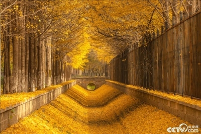 北京海淀區(qū)溫泉鎮(zhèn)街角公園,銀杏樹葉飄落,滿地金黃。