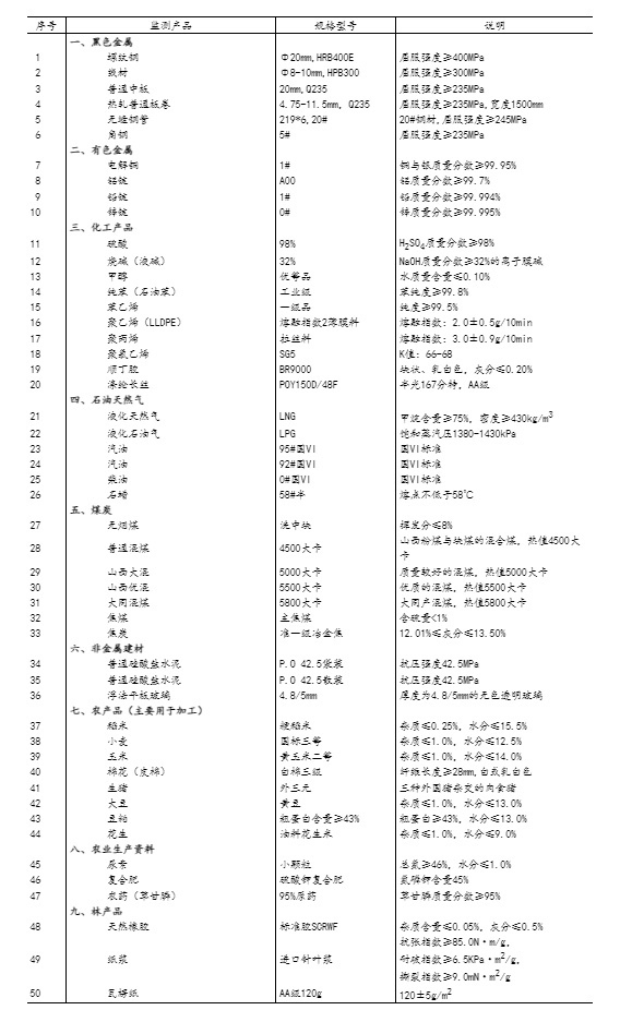 流通領(lǐng)域重要生產(chǎn)資料市場(chǎng)價(jià)格監(jiān)測(cè)內(nèi)容包括9大類50種產(chǎn)品的價(jià)格。類別與產(chǎn)品規(guī)格說(shuō)明詳見附表。
