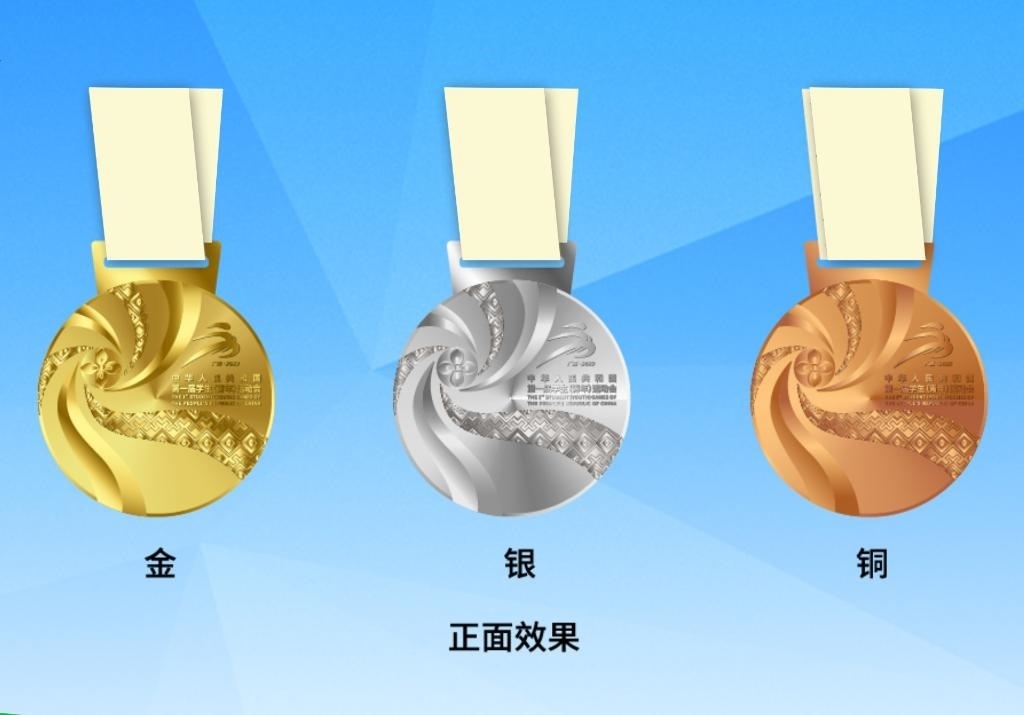 首屆學(xué)青會(huì)獎(jiǎng)牌正面采用繡球、壯錦等廣西元素,以繡球?yàn)樵O(shè)計(jì)焦點(diǎn),通過壯錦飄帶向外綻放,如一朵盛開的鮮花,表達(dá)歡迎四方友人共赴學(xué)青盛會(huì)的美意;獎(jiǎng)牌背面以廣西銅鼓鼓面為原型,中心太陽(yáng)紋象征著年輕人的活力和熱情,四方配以圖騰鳥,有著吉祥的寓意;外圈環(huán)繞了學(xué)青會(huì)的英文名稱和銅鼓經(jīng)典紋飾云雷紋。獎(jiǎng)牌整體寓意“團(tuán)結(jié)、活力、綻放”。