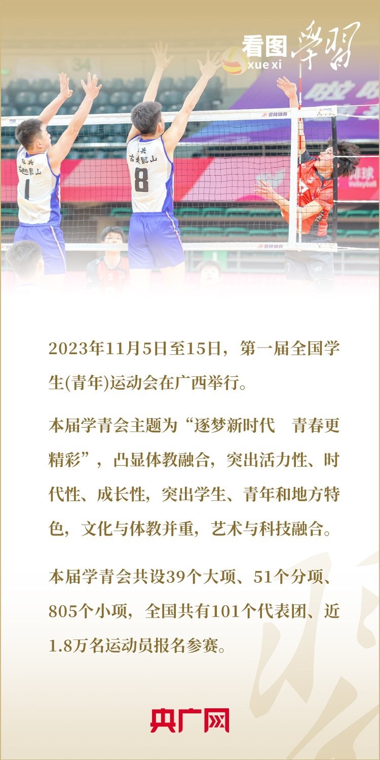 11月5日至15日,第一屆全國學(xué)生(青年)運(yùn)動(dòng)會(huì)在廣西舉行。這是全國青年運(yùn)動(dòng)會(huì)和全國學(xué)生運(yùn)動(dòng)會(huì)合并后的第一屆運(yùn)動(dòng)會(huì),是加快體育強(qiáng)國建設(shè)、加快健康中國建設(shè)、深化體教融合發(fā)展、促進(jìn)青少年健康成長的重要舉措。