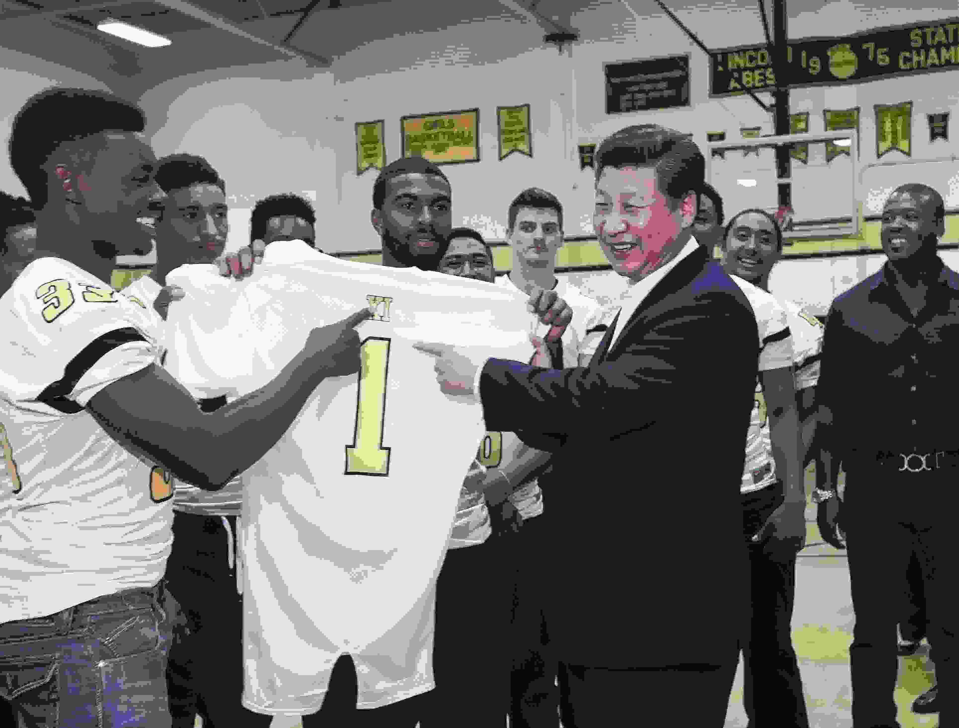△ 2015年9月23日,國家主席習(xí)近平參觀美國塔科馬市林肯中學(xué)。這是習(xí)近平接受學(xué)生們贈(zèng)送的橄欖球衣。
