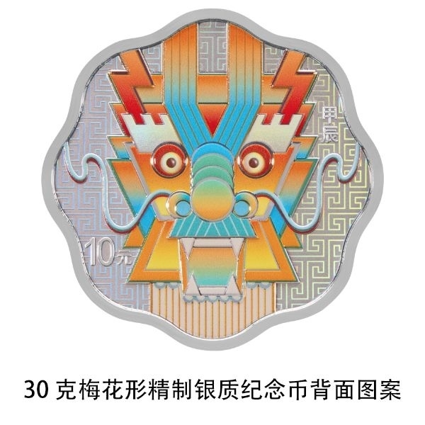 30克梅花形銀質(zhì)紀(jì)念幣背面圖案為裝飾龍?jiān)煨停r以回紋紋飾。