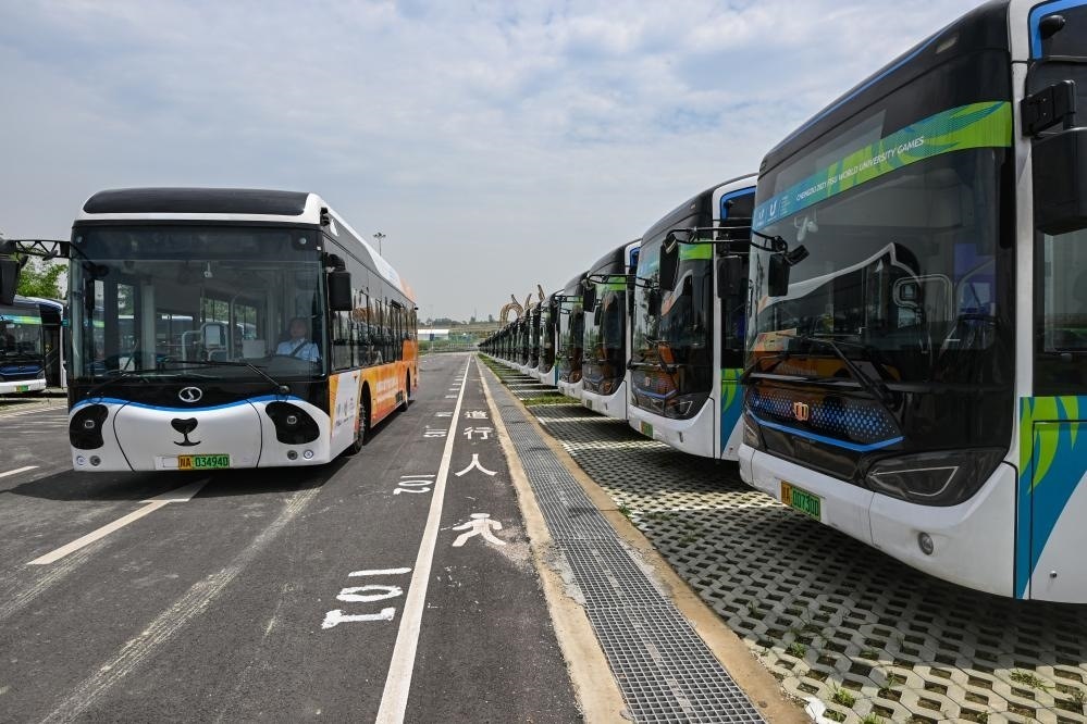 這是負責成都第31屆世界大學生夏季運動會交通保障的新能源公交車。新華社記者王曦 攝