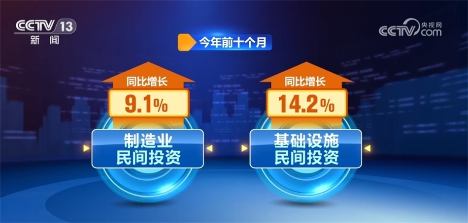 ?????? 政府有效投資疊加政策引領(lǐng),正激發(fā)全社會(huì)投資活力。今年前十個(gè)月,制造業(yè)、基礎(chǔ)設(shè)施民間投資同比分別增長(zhǎng)9.1%和14.2%。