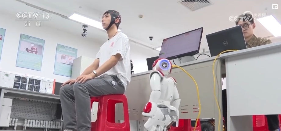記者來到這間研發(fā)人形機(jī)器人的實(shí)驗(yàn)室時(shí),科研團(tuán)隊(duì)正在測(cè)試機(jī)器人的同步能力。眼前的機(jī)器人不僅可以通過攝像頭,捕捉人們的動(dòng)作后進(jìn)行同步模仿,還可以通過腦機(jī)接口、肌電交互等方式,捕捉人們的腦電信息和運(yùn)動(dòng)意圖,直接同步控制機(jī)器人的行為。