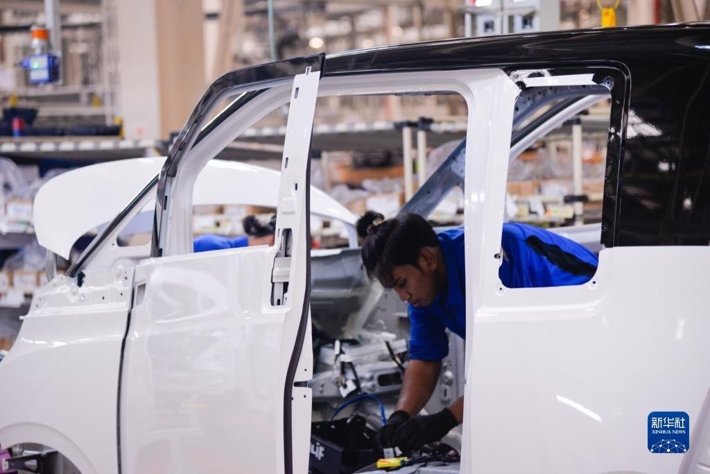 2月24日,在印度尼西亞勿加泗,工人在上汽通用五菱印尼汽車有限公司工廠的生產(chǎn)線上作業(yè)。新華社記者 徐欽 攝