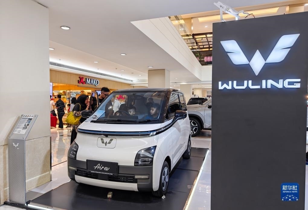 10月1日,在印度尼西亞雅加達(dá)一家商場(chǎng),人們?cè)隗w驗(yàn)一輛五菱新能源車Air ev(手機(jī)照片)。新華社記者 徐欽 攝