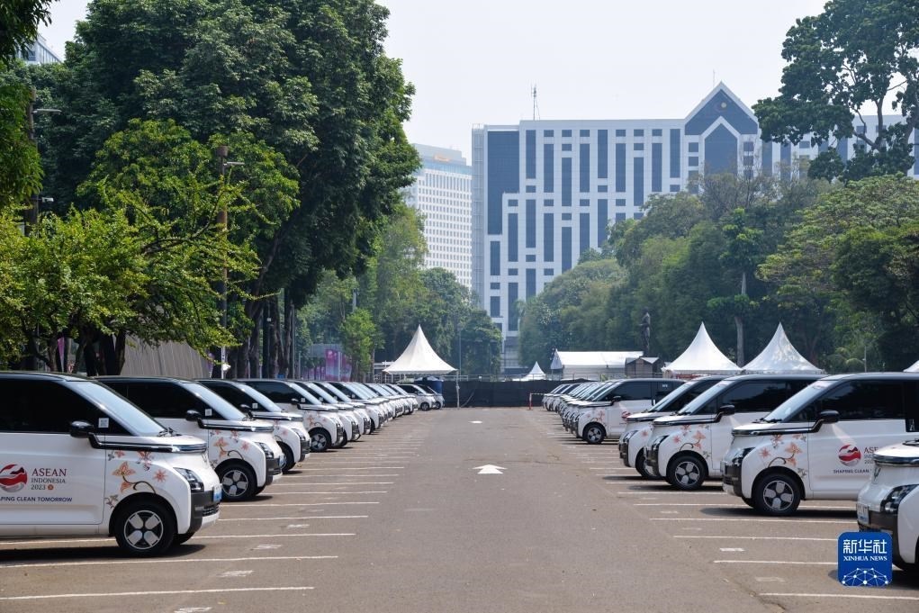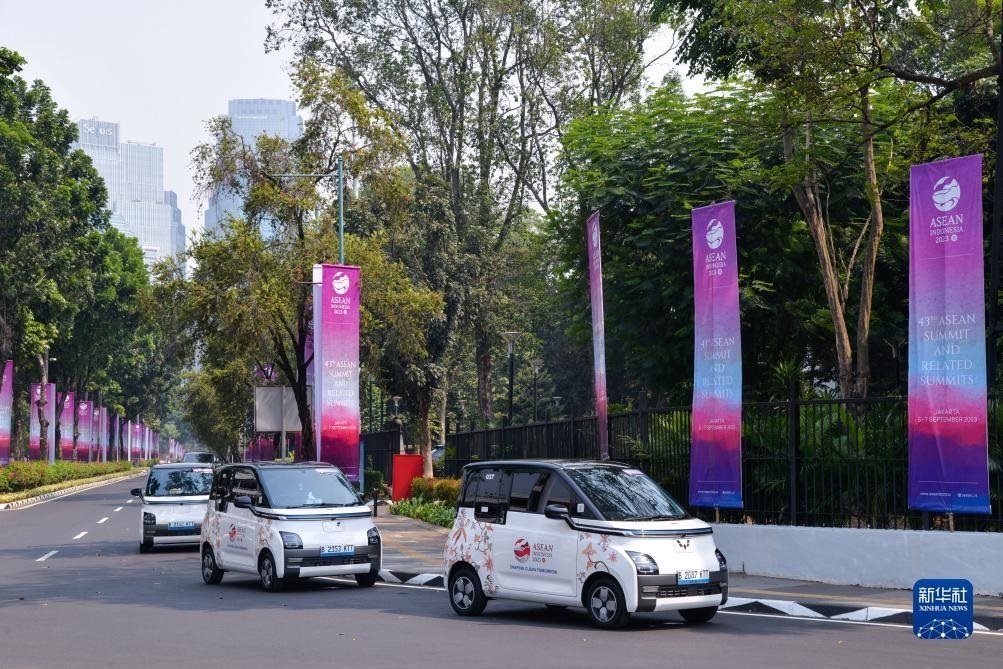這是9月6日在印度尼西亞雅加達(dá)第43屆東盟峰會(huì)會(huì)場(chǎng)外拍攝的五菱新能源車Air ev。新華社記者 徐欽 攝