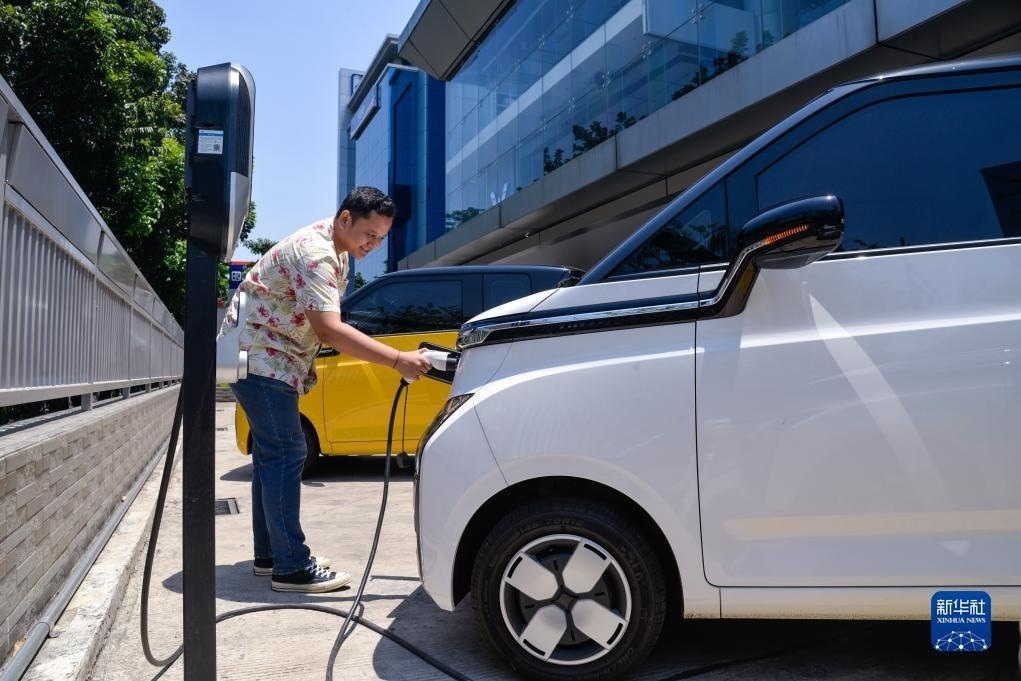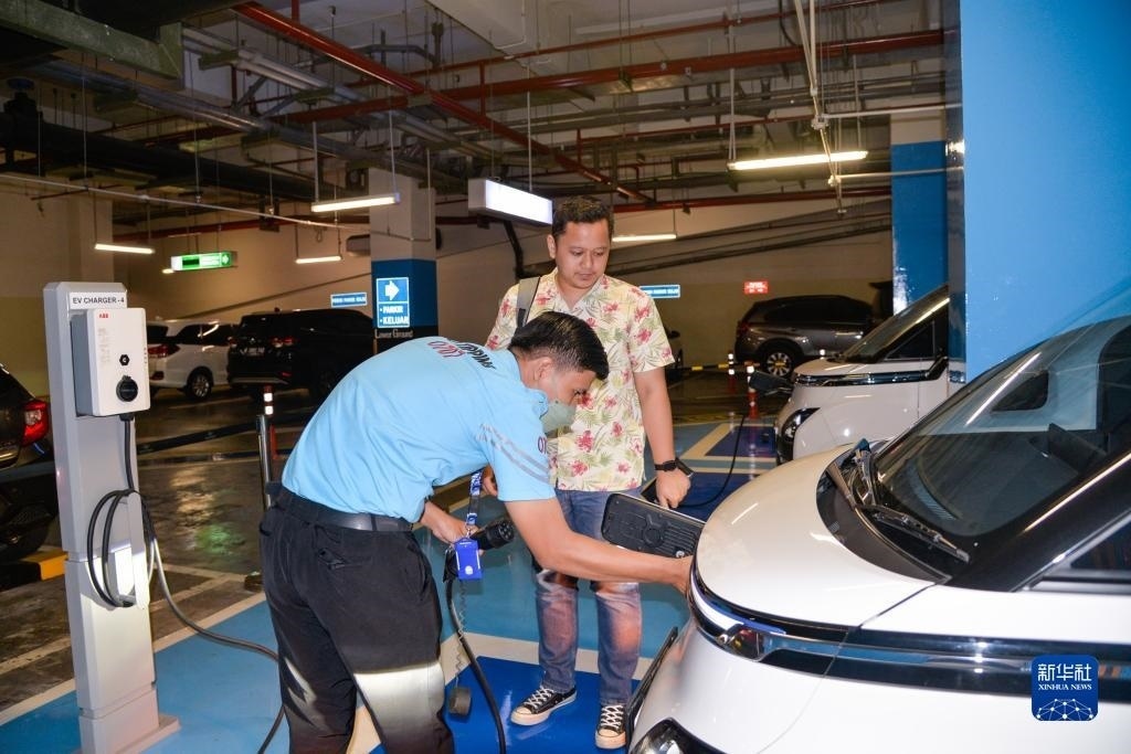 9月29日,在印度尼西亞雅加達(dá)一家商場(chǎng)的地下停車場(chǎng),工作人員為一位五菱新能源車Air ev車主結(jié)束充電。新華社記者 徐欽 攝