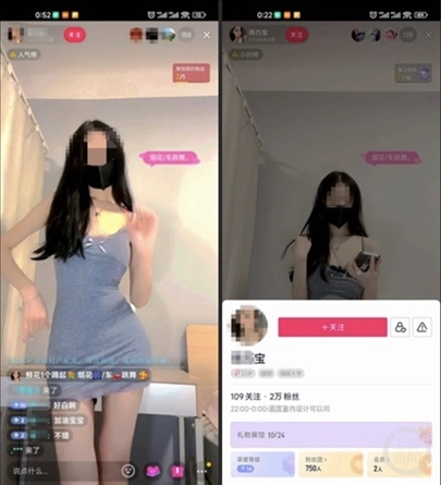 在另一社交平臺中,面容姣好、標(biāo)簽為“大學(xué)生”的女主播“丫頭XXX”在23日凌晨1點過仍在直播,她和一位上了年紀(jì)的男性連麥互動,直播間標(biāo)簽寫著“穿云箭帶走、啤酒俯臥撐、私人**任你、喜歡你進(jìn)裙”。