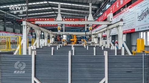 中交二航局常泰長江大橋項目部常務副經理王輝:“傳統(tǒng)的橋塔鋼筋怎么做呢?通過吊機把鋼筋吊到塔上,作業(yè)工人一根根把鋼筋綁起來,個人能力有差別,質量和精度,鋼筋間距也很難控制,現(xiàn)在我們采用什么理念呢?就是部品的理念,把塔的鋼筋在下面做成一塊一塊的,就像搭積木一樣,大型吊機把它吊上去,然后一節(jié)節(jié)堆起來?!?/p>