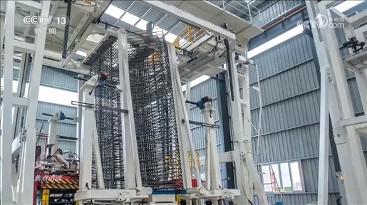 王輝:“通過手機掃描能夠數(shù)字化顯示鋼筋所有的生產信息,鋼筋智能生產的設備把原材料鋼筋做成單元件,通過這個設備的組裝形成了鋼筋片體。像這樣的片體5號塔要用3萬個,大概分成了3200組,每一組鋼筋用的部位都不一樣,為了精準識別它用在哪里,每一組要給它一個識別信息,做一個二維碼,通過手機掃描就可以知道它要用在哪個地方。”