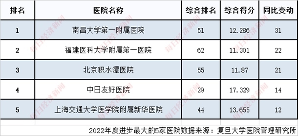 今年,全國(guó)共有100家醫(yī)院進(jìn)入“復(fù)旦版中國(guó)醫(yī)院綜合排行榜”,中國(guó)醫(yī)學(xué)科學(xué)院北京協(xié)和醫(yī)院、四川大學(xué)華西醫(yī)院、中國(guó)人民解放軍總醫(yī)院、上海交通大學(xué)醫(yī)學(xué)院附屬瑞金醫(yī)院和復(fù)旦大學(xué)附屬中山醫(yī)院位列《2022年度中國(guó)醫(yī)院綜合排行榜》前五名。