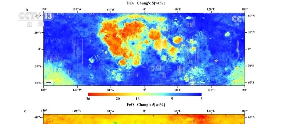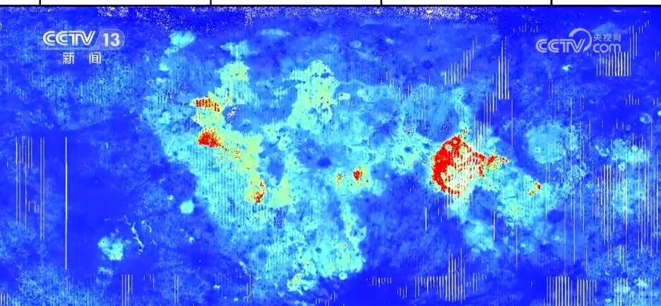 吉林大學(xué)地球科學(xué)學(xué)院教授 楊晨:之前我們主要采用的月球表面元素成分圖,主要是基于美國和蘇聯(lián)的樣品數(shù)據(jù),主要反映的是月球30億年前的演變。我國采樣的嫦娥五號數(shù)據(jù),可以反映年輕的、20億年以來的月球歷史。我們基于嫦娥五號樣品數(shù)據(jù),獲得了月球表面六種主要元素在月球上的分布情況。其中,紅色部分代表元素含量相對較高,比如鈦和鐵。我們發(fā)現(xiàn)在月海附近(區(qū)域),它們的含量相對豐富,這兩種元素對于判定年輕月海玄武巖具有重要意義。