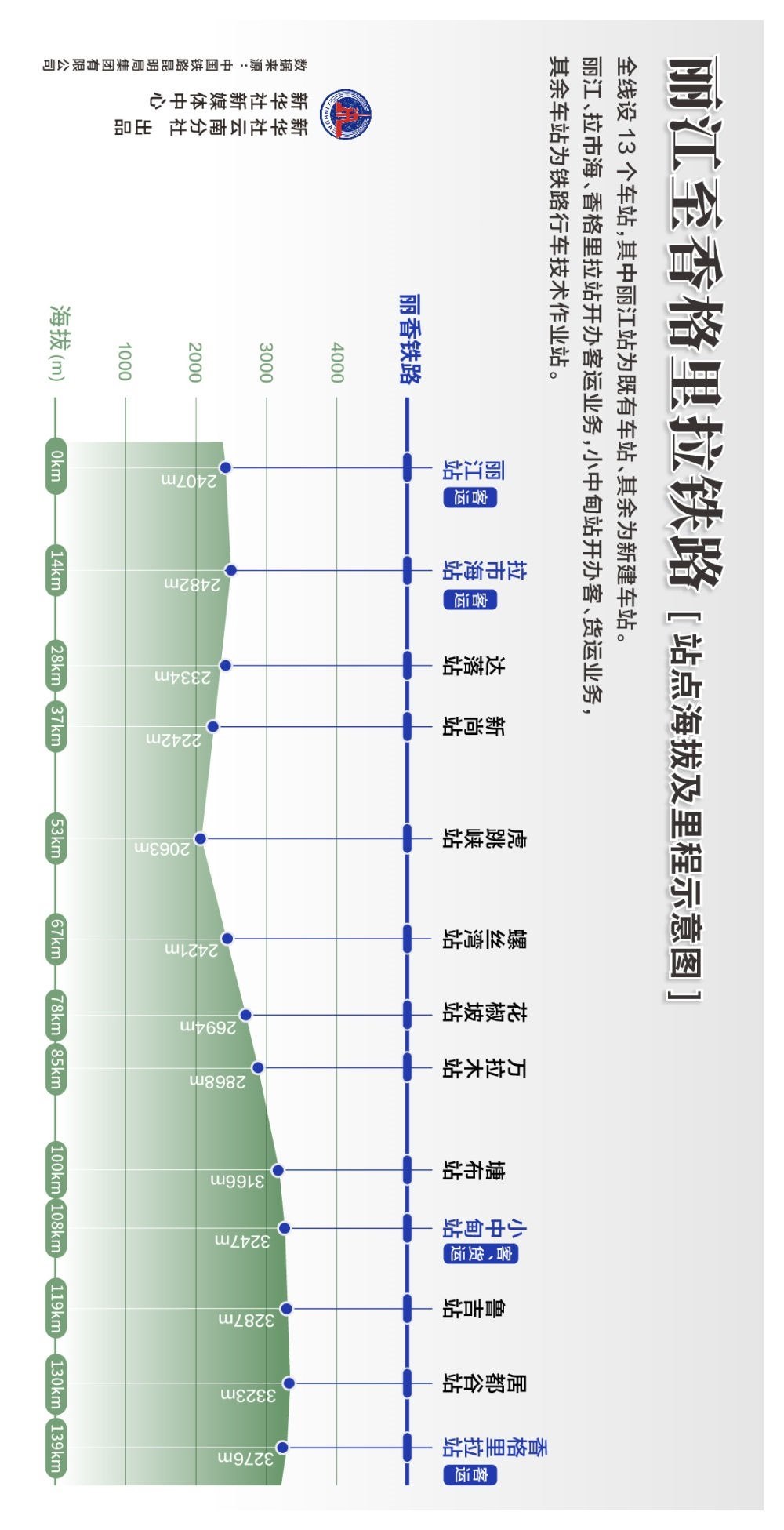全線共設(shè)有13個車站,其中麗江站為既有車站,其余為新建車站。麗江、拉市海、香格里拉站開辦客運(yùn)業(yè)務(wù),小中甸站開辦客、貨運(yùn)業(yè)務(wù),其余車站為鐵路行車技術(shù)作業(yè)站。