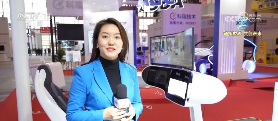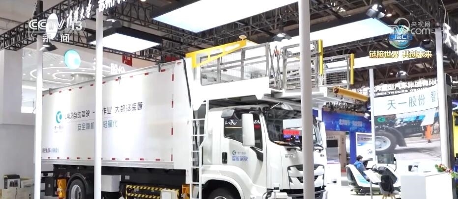 總臺央視記者 張歆:在本屆鏈博會上,我們也看到了許多智能專用車。大家可以看到在我身旁就是一臺智能航空食品專用車,這臺重量達到21噸左右的“大塊頭”裝了許多個雷達,通過5G的算法就能夠?qū)崿F(xiàn)無人駕駛和無人作業(yè)。