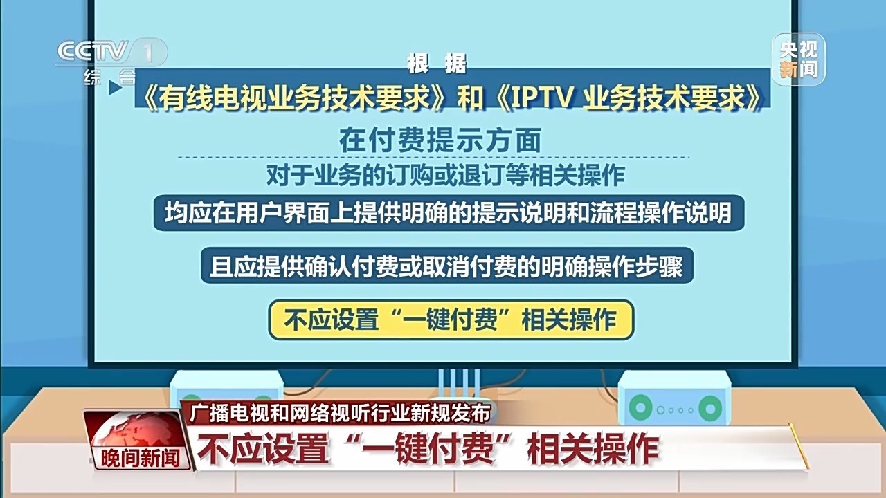 在付費提示方面,對于業(yè)務(wù)的訂購或退訂等相關(guān)操作,均應(yīng)在用戶界面上,提供明確的提示說明和流程操作說明,且應(yīng)提供確認付費或取消付費的明確操作步驟,不應(yīng)設(shè)置“一鍵付費”相關(guān)操作。此外,有線電視和IPTV遙控器應(yīng)具備快捷看直播頻道的按鍵,通過此按鍵直接進入全屏直播,按鍵名稱應(yīng)為“看電視”。