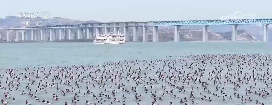 在三門峽黃河生態(tài)廊道陜州區(qū)段,上萬只紅頭潛鴨密密麻麻,自由游弋,紅彤彤的一片,猶如紅色的浪潮,蔚為壯觀。成群的紅頭潛鴨也吸引了在這片水域乘船游覽的游客,船行大河之上,候鳥棲息水中,場(chǎng)景難得一見。
