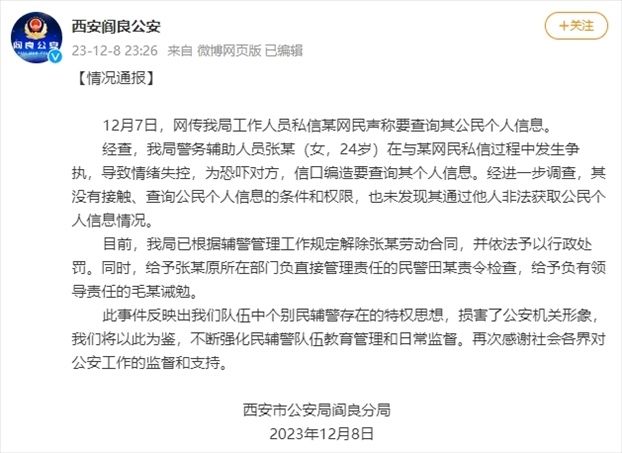 ·西安閻良公安通報(bào)警務(wù)輔助人員稱要查網(wǎng)友個(gè)人信息:解除勞動合同,予以行政處罰。