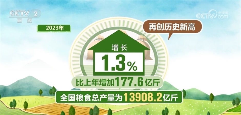 國(guó)家統(tǒng)計(jì)局今天(12月11日)發(fā)布的數(shù)據(jù)顯示,2023年,全國(guó)糧食總產(chǎn)量為13908.2億斤,比上年增長(zhǎng)1.3%,全年糧食產(chǎn)量再創(chuàng)歷史新高。