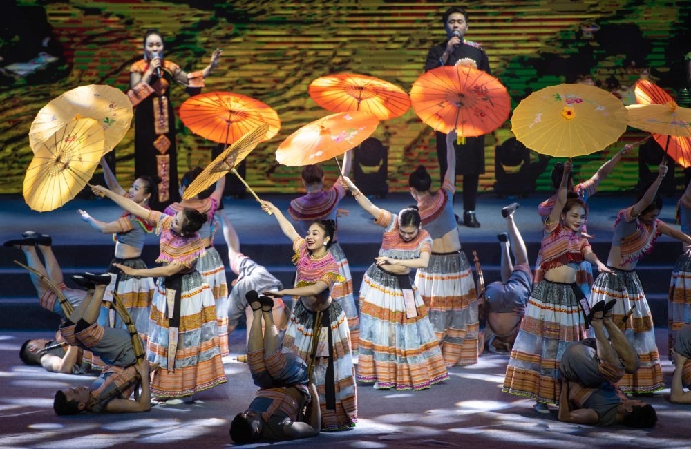 2023年1月18日,以“同心筑厚誼 攜手共發(fā)展”為主題的2023年中越跨國春節(jié)聯(lián)歡晚會(huì)在中國云南省紅河哈尼族彝族自治州河口瑤族自治縣舉行,越南老街省民族藝術(shù)歌舞團(tuán)的演員在晚會(huì)上表演歌舞《漂浮在云端的節(jié)日》。