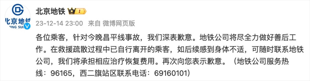 ·12月14日晚,北京地鐵昌平線事故導(dǎo)致30余人受傷,無(wú)人員死亡。北京地鐵發(fā)布微博致歉:將承擔(dān)相應(yīng)治療恢復(fù)費(fèi)用。