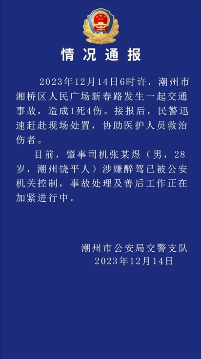 ·廣東潮州一男子涉嫌醉駕致1死4傷,警方通報(bào):肇事司機(jī)已被控制。