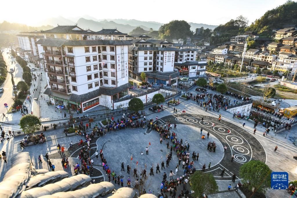 在貴州省雷山縣龍頭街道一處易地扶貧搬遷安置點(diǎn),村民和游客在苗年活動中跳蘆笙舞(2020年11月19日攝)。新華社記者 楊文斌 攝