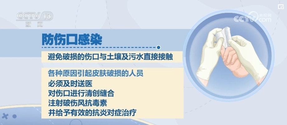 如果有受傷的情況,應(yīng)避免破損的傷口與土壤及污水直接接觸。各種原因引起皮膚破損的人員必須及時送醫(yī),對傷口進行清創(chuàng)縫合、注射破傷風抗毒素,并給予有效的抗炎對癥治療。