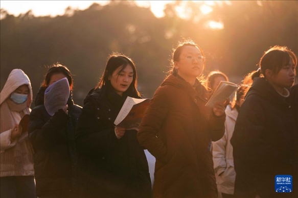 12月23日,在山東省煙臺市萊山一中考點外,考生抓緊時間復習。