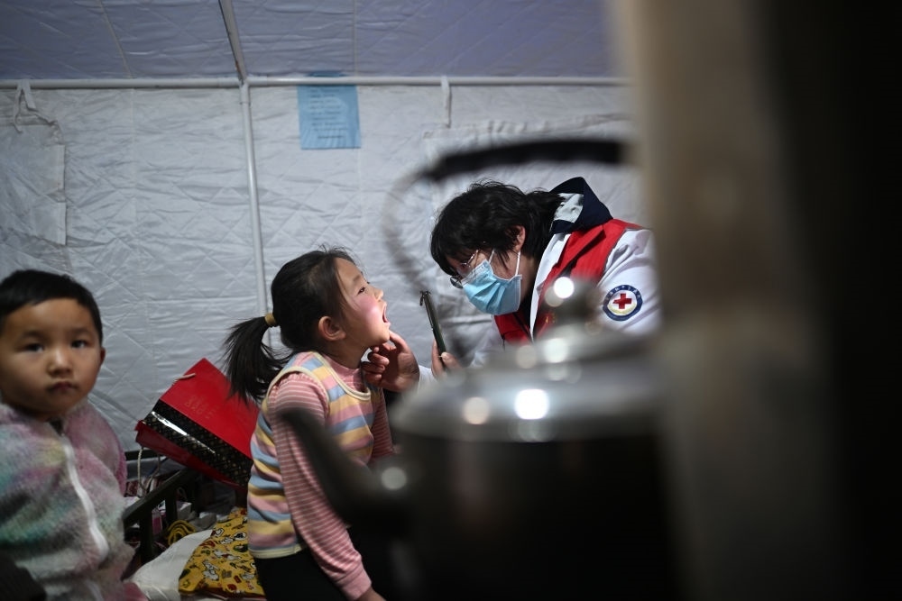在青海省海東市民和回族土族自治縣官亭鎮(zhèn)喇家村安置點(diǎn),山東援青醫(yī)生李鴻皓(右)為喇生婷檢查身體(12月23日攝)。積石山6.2級(jí)地震發(fā)生以來(lái),在青海省海東市民和回族土族自治縣,當(dāng)?shù)蒯t(yī)療機(jī)構(gòu)和援青醫(yī)療隊(duì)通過(guò)設(shè)立醫(yī)療點(diǎn)、開(kāi)展巡診等方式保障安置點(diǎn)群眾就醫(yī)服務(wù),守護(hù)群眾健康。新華社記者 張宏祥 攝