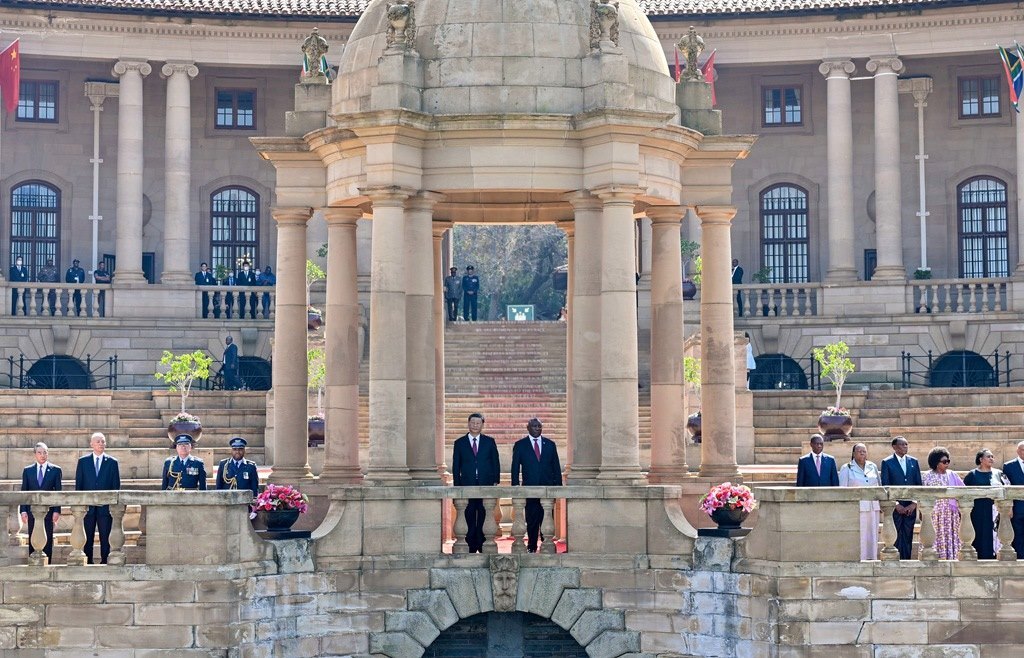 當(dāng)?shù)貢r(shí)間2023年8月22日上午,正在南非進(jìn)行國(guó)事訪問(wèn)的國(guó)家主席習(xí)近平在比勒陀利亞總統(tǒng)府同南非總統(tǒng)拉馬福薩會(huì)談。會(huì)談前,拉馬福薩在總統(tǒng)府廣場(chǎng)為習(xí)近平舉行歡迎儀式。