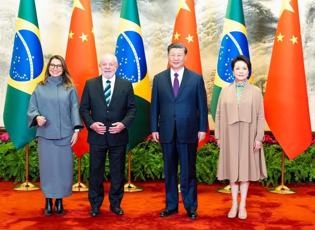 2023年4月14日下午,國(guó)家主席習(xí)近平在北京人民大會(huì)堂同來(lái)華進(jìn)行國(guó)事訪問(wèn)的巴西總統(tǒng)盧拉舉行會(huì)談。這是會(huì)談前,習(xí)近平和夫人彭麗媛同盧拉和夫人羅桑熱拉合影。