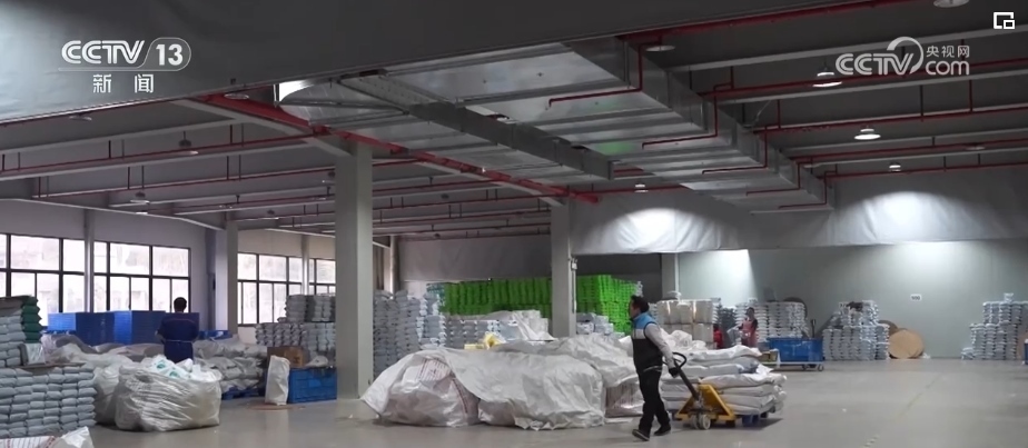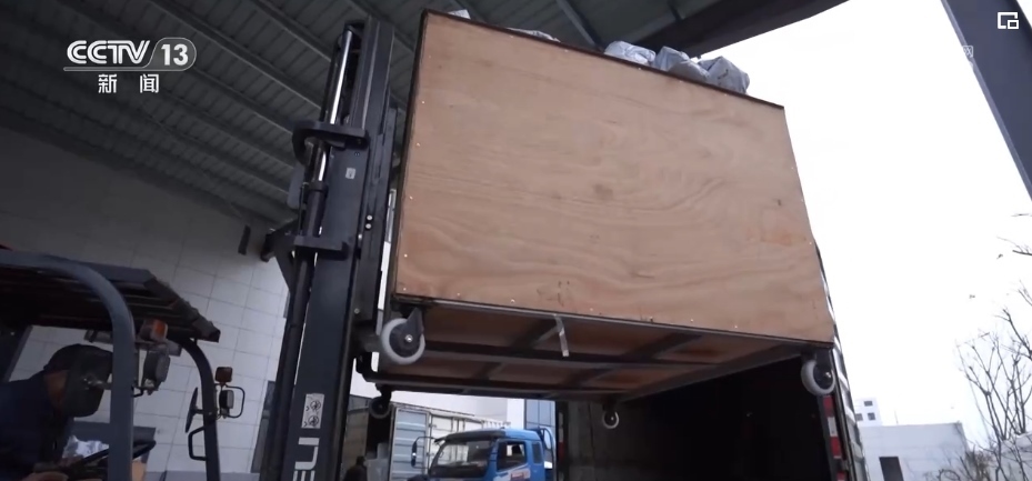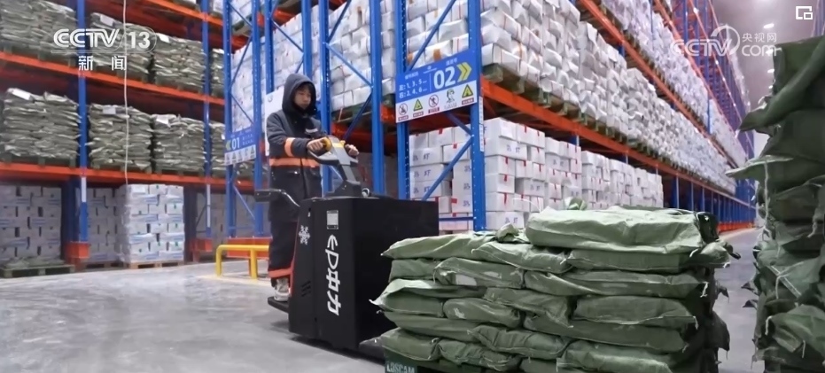 在浙江長興的一家企業(yè)廠房里,廠家工作人員根據(jù)訂單快速分發(fā)、貼單、裝貨;快遞小哥則在一樓出貨區(qū),將叉車上的貨物運上郵政貨車。