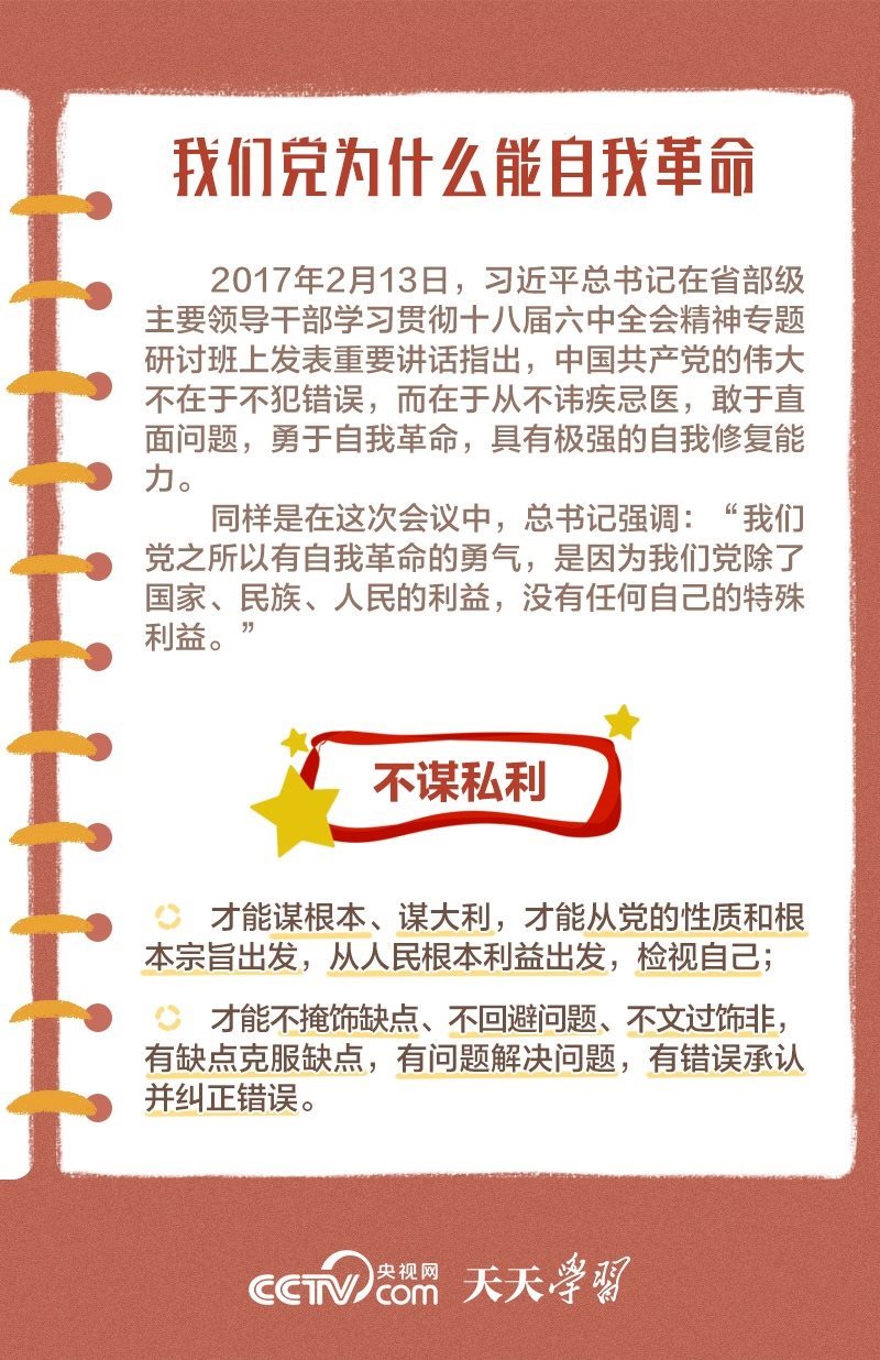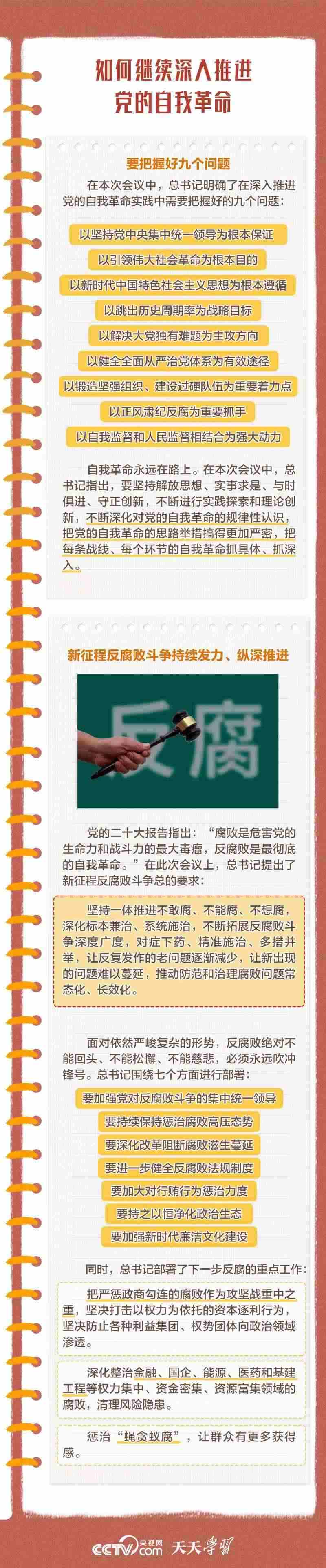 勇于自我革命是我們黨最鮮明的品格和最大的優(yōu)勢(shì),總書記多次對(duì)推進(jìn)黨的自我革命作出重要部署。此次會(huì)議上,總書記深刻闡述了黨的自我革命的重要思想,明確提出需要把握好九個(gè)問題,并對(duì)持續(xù)發(fā)力、縱深推進(jìn)反腐敗斗爭(zhēng)作出戰(zhàn)略部署。央視網(wǎng)《天天學(xué)習(xí)》與您一起學(xué)習(xí)。