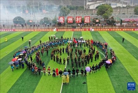 1月6日,人們?cè)?024年貴州“村超”預(yù)選賽開幕式上表演民族節(jié)目(無人機(jī)照片)。新華社發(fā)(楊文舒攝)