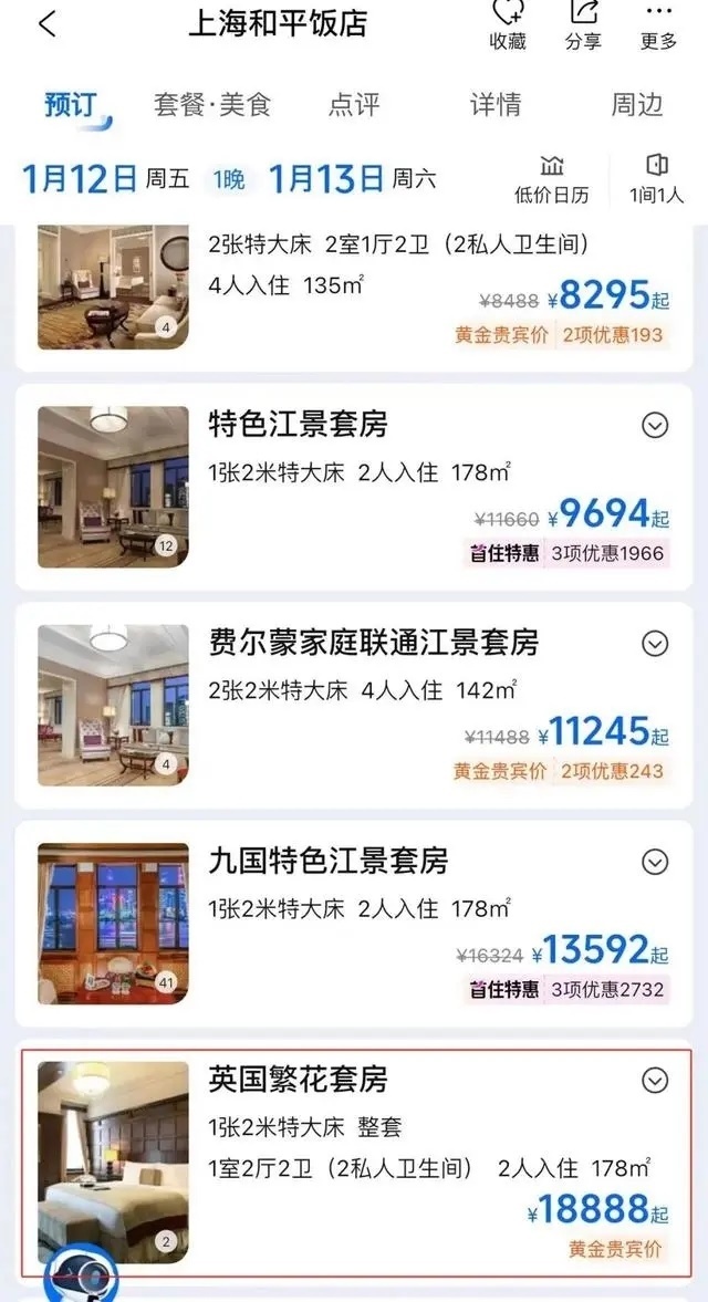 劇中出鏡率極高的和平飯店英國(guó)套房也成了“熱門產(chǎn)品”。目前,和平飯店英國(guó)套房在旅游平臺(tái)上被命名為“英國(guó)繁花套房”。9日查詢攜程旅行平臺(tái)發(fā)現(xiàn),9-11日該套房已售罄,12日入住一晚的價(jià)格為18888元。據(jù)媒體此前報(bào)道,這一套房在今年春節(jié)期間含早價(jià)為22888元一晚。