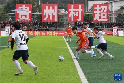 1月6日,在貴州省榕江縣“村超”球場(chǎng),兩支村級(jí)球隊(duì)進(jìn)行比賽。新華社發(fā)(羅京來攝)