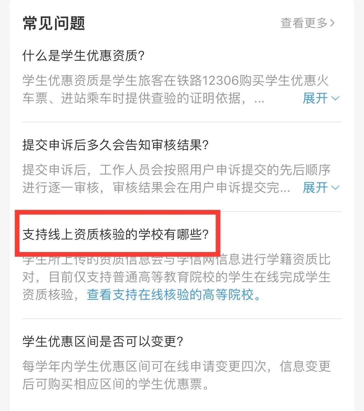 打開鐵路12306App,右下角進入“我的”頁面,在學(xué)生資質(zhì)填寫頁面的“常見問題”中,找到“支持線上資質(zhì)核驗的學(xué)校有哪些?”即可查看支持在線核驗的學(xué)校名單。