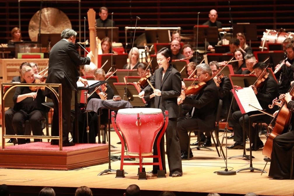1月12日,在美國(guó)費(fèi)城,上海交響樂團(tuán)打擊樂演奏家付藝霏(中)在2024年費(fèi)城交響樂團(tuán)新春音樂會(huì)上演出。