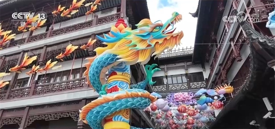 這幾天,南京路上各種龍?jiān)匮b置和商品將步行街裝飾一新;在南京西路商圈,這個(gè)造型裝置宛若一只巨龍騰空而起,頗有氣勢;在上海徐家匯、中山公園、前灘等商圈,各色龍?jiān)責(zé)艚M亮相;在龍華商圈,戲臺(tái)也演繹出龍的造型,大街小巷春節(jié)氛圍滿滿。